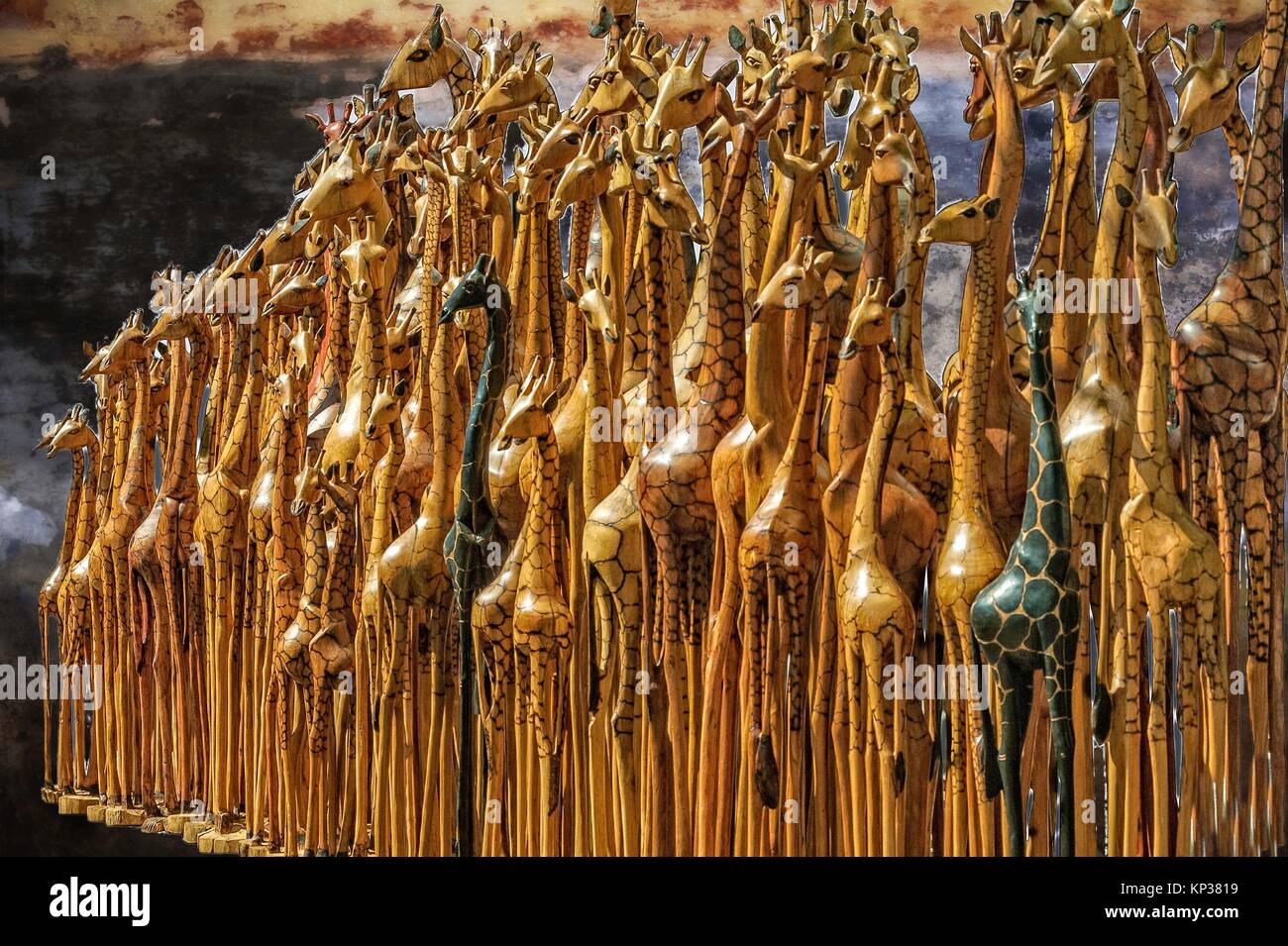 Hand Carved Wooden Giraffes On A Mass Display South Africa Stock