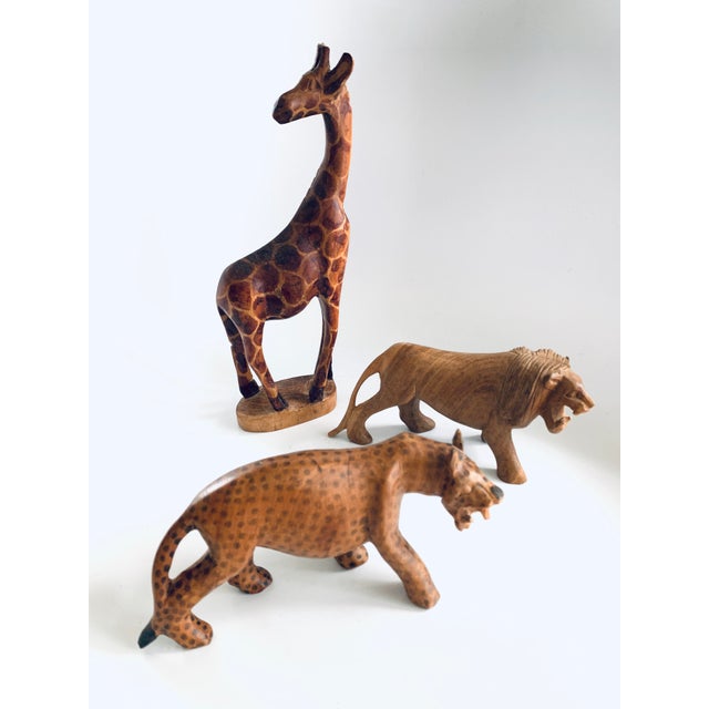 Vintage African Wood Carved Animals Giraffe Leopard Lion Set Of