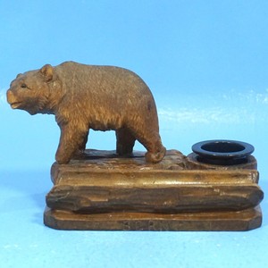 Antique Swiss Black Forest Wood Carving Inkwell Pentray Bear Glass