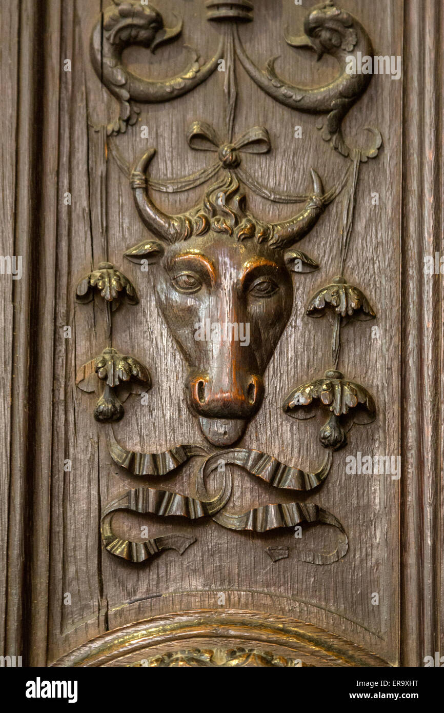 Wood Carving Of Bull S Head France Stock Photo 53974129 Alamy